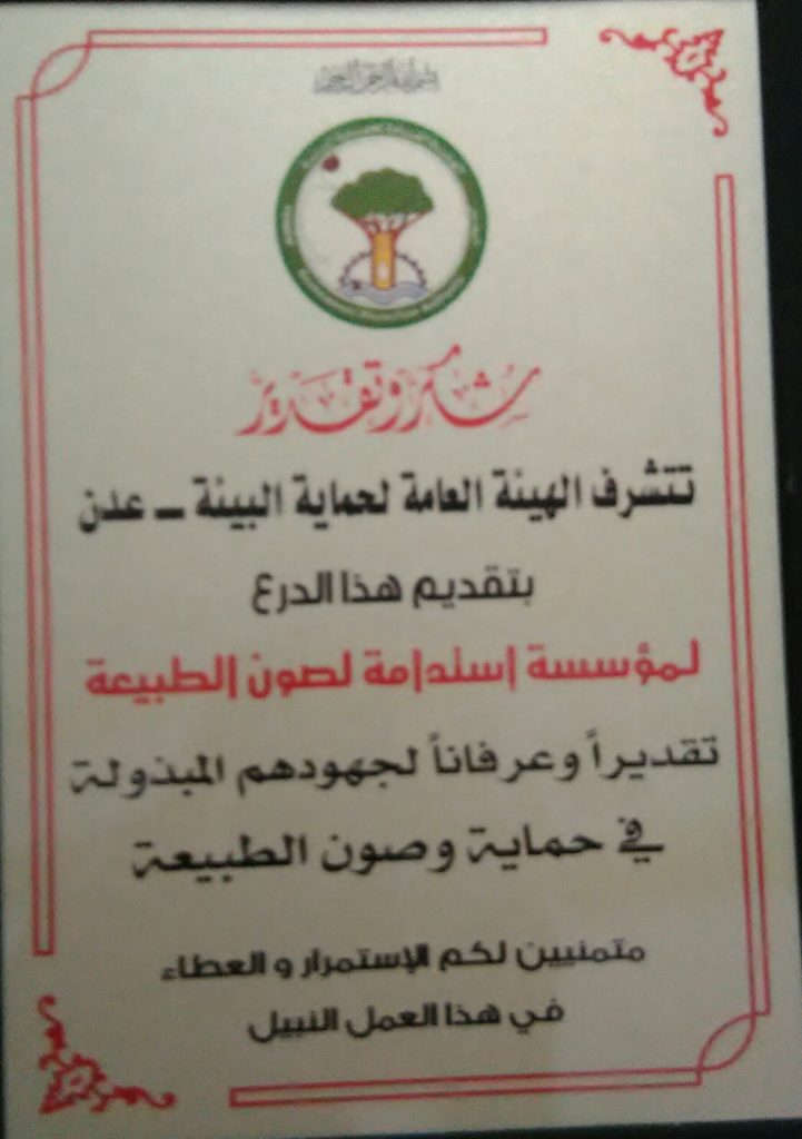 تم اليوم تكريم مؤسسة استدامة لصون الطبيعة بدرع قدم من الهيئة العامة لحماية البيئة بالمحافظة والذي تسلمه المدير التنفيذي للمؤسسة أ / وليد الحكيمي في الحفل الذي نظمته الهيئة العامة لحماية البيئة عدن وبرعاية القائم بأعمال محافظ محافظة عدن بمناسبة الاحتفال باليوم الوطني للبيئة الذي يصادف العشرين من فبراير من كل عام وتحت شعارمعا من اجل مواجهة الكوارث الطبيعية والتخفيف من تأثيراتها على المجتمع وذلك لإسهامات المؤسسة الحثيثة لحماية البيئة وصون موارده الطبيعية من خلال أنشطتها الفاعلة ذات الأثر الكبيرة على المستوى الوطني .